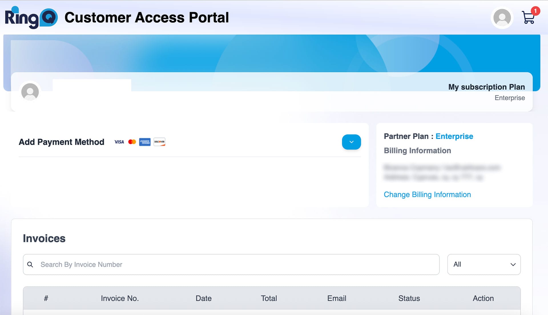From the Invoice page you can search for a specific invoice and view all your invoices in the table – along with important information about each invoice.