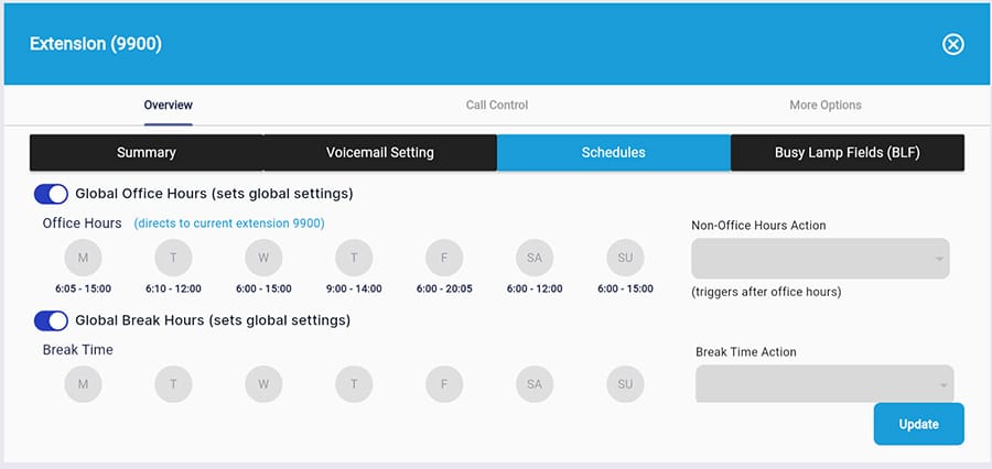 Break Time. When Global Break Hours is disabled, the user can adjust the office hours and each time of the day is set to default (None). - Break Time Action (triggers during break time). Click on the Dropdown button to select an extension, customize number, or action.