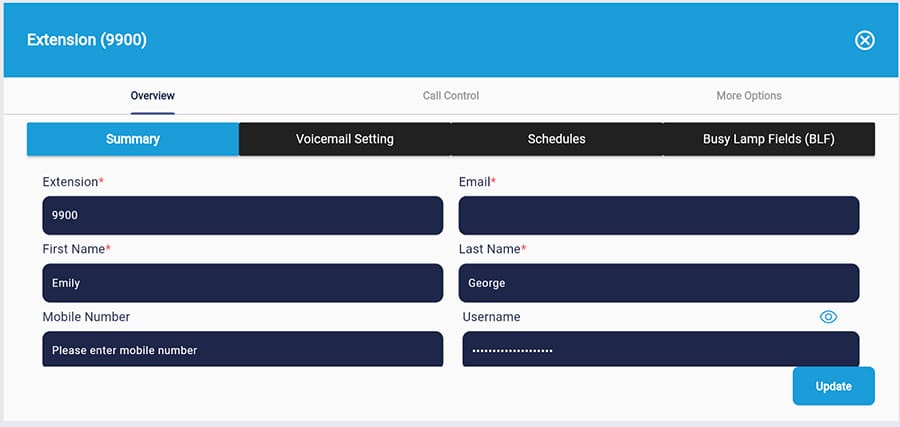 - Overview: edit basic information about the user, adjust voicemail settings, add and edit work schedules and BLF.