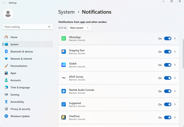 - Menu Navigation: Windows 11 has a simplified settings menu where “Notifications” is its own section under System
