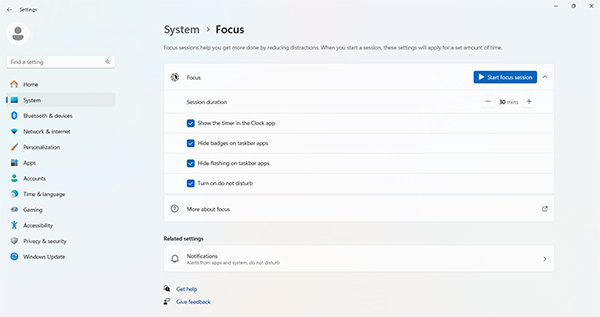 - Focus Modes: Windows 11 expands on Focus assist with additional focus modes