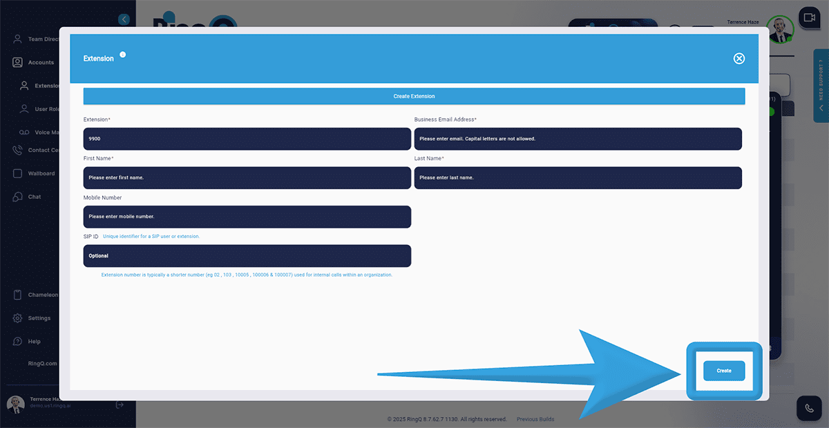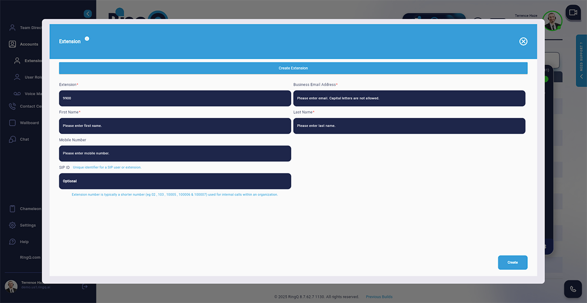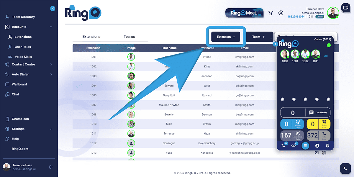 An extension is a unique internal number assigned to a user within your RingQ system, allowing quick and direct communication between team members without dialing full phone numbers. Setting up extensions is a fundamental step in configuring your system, ensuring each user can make and receive calls, transfer calls internally, and be part of ring groups or teams. This section covers how to create and assign extensions to users in RingQ.