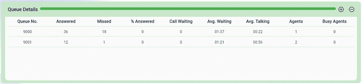 - Busy Agents – Displays the number of agents in the queue who are currently on a call.